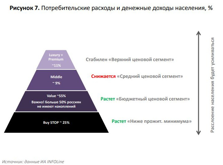 Это смещение объяснимо. Реальные доходы населения упали. Подстраиваясь под экономические условия, люди стали экономить во всем, причем улучшение экономической ситуации и стабилизация рубля никак не отразились на уже выработанной привычке не тратить лишних денег. Для 40 % населения экономия стала образом жизни.