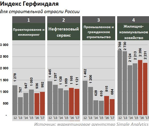 Недавно маркетинговое агентство Simple Analytics провело традиционный мониторинг уровня конкуренции в строительной отрасли РФ. Данные конкурентного бенчмаркинга охватили несколько рыночных сегментов: проектирование и инжиниринг, нефтегазовый сервис, промышленное и гражданское строительство, а также сектор жилищно-коммунального хозяйства.