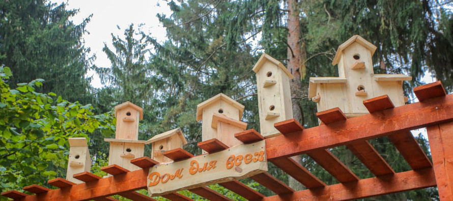 На полянку, где расположился «Дом для всех», ведут две входные группы. Они выполнены из древесины и украшены сверху скворечниками, в которых вполне могут селиться пернатые. Наш собеседник объясняет, что сделали эти конструкции крупнее, чем планировали изначально, для того, чтобы на территорию могла беспрепятственно заехать обслуживающая спецтехника. Сразу за импровизированными входами вдоль пешеходной дорожки то тут, то там на деревьях видим кормушки. Все они разные: одна в форме домика, другая напоминает кресло, третья представляет собой стульчик со столиком… Рядом с ними — информационные таблички, где написано, чем можно и чем нельзя угощать жителей леса. К слову, в самих кормушках настоящий пир: местные разложили внутри кусочки яблок, семена, орехи… Подмечаем, что в отличие от скамеек и прочих малых архитектурных форм, домики и «столовые» не покрыты декоративно-защитным составом.