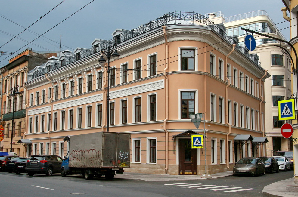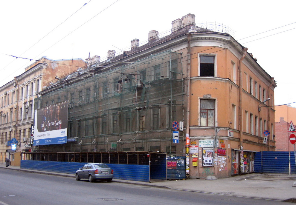 На углу Загородного проспекта и Щербакова переулка воссоздали часть дома Рогова, со скандалом снесенного десять лет назад. Примерно половину пятна, где стоял 200-летний памятник, застроили семиэтажным бизнес-центром.