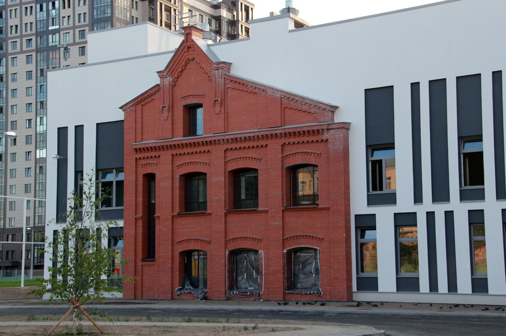 Среди подобных утрат оказался запоминающийся фасад одного из производственных корпусов (Московский проспект, 115, литера Э), построенного в конце XIX века. Он располагался в конце улицы Глебы Успенского. Снесли его летом 2019 года в рамках строительства школы. Застройщиком было ООО «ЖК „Московский“», входящее в группу «Эталон».