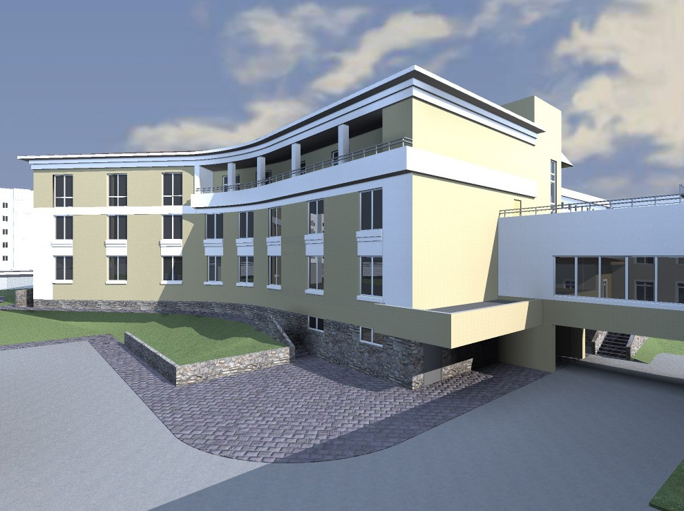 Теперь интернат решено расширить за счет нового корпуса. Он расположится в северо-западной части участка со стороны Малиновской улицы. Трехэтажное здание по проекту ООО «Инвестиционная строительная компания „НКС“» будет выполнено в виде скобки. С основным корпусом его соединят переходом на уровне второго этажа.