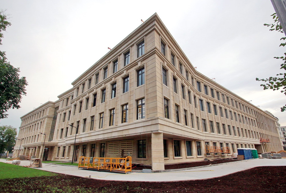 На Спортивной улице Крестовского острова завершилось строительство школы. Ее архитектура напоминает предреволюционную эклектику, но с дополнением в виде косых ниш и стеклянной стены.