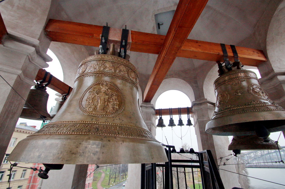 Отец Богдан передает меня в руки прораба Андрея, который, подобно герою одной известной философской притчи, на мой вопрос отвечает: «Я строю храм! Кстати, второй уже», — и провожает меня на колокольню. Там я впервые увидела церковные колокола так близко. Главный колокол уникален: на одной его стороне гравюра 1718 года с видом Петербурга, а с другой изображение города 300 лет спустя, современный вид; кажется, я даже разглядела «Лахта-центр».