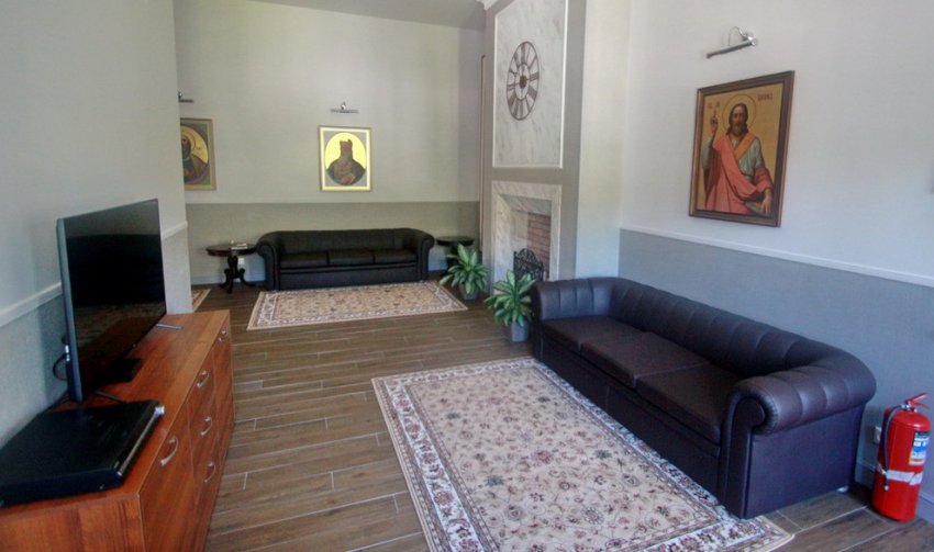 «Ну пойдемте наверх, покажу наш многофункциональный религиозный центр», — отец Фома торопится: через 20 минут должны привезти рояль в трапезную, ему нужно лично проследить за доставкой. Выйдя из подвала, идем к бывшей проходной и автосервису. Их перестроили под причтовый дом, да так, что не узнать. Сейчас здесь та самая трапезная, библиотека, в которой любой желающий может познакомиться с духовной литературой, воскресная школа из двух классов, рассчитанная на десять детей, администрация и церковная лавка.