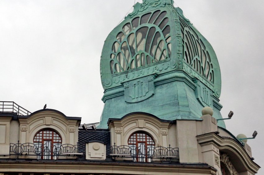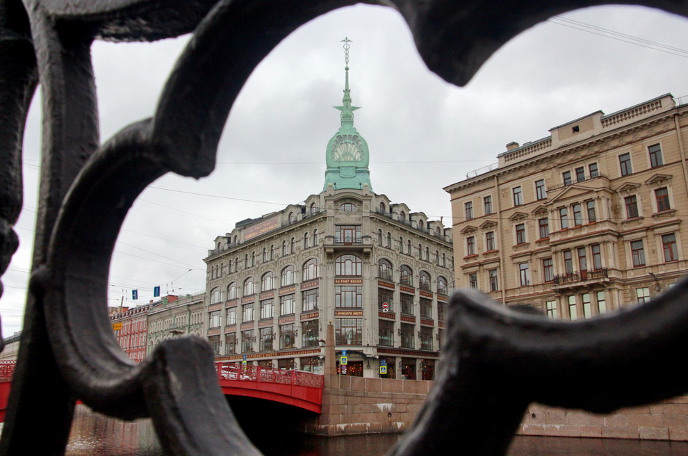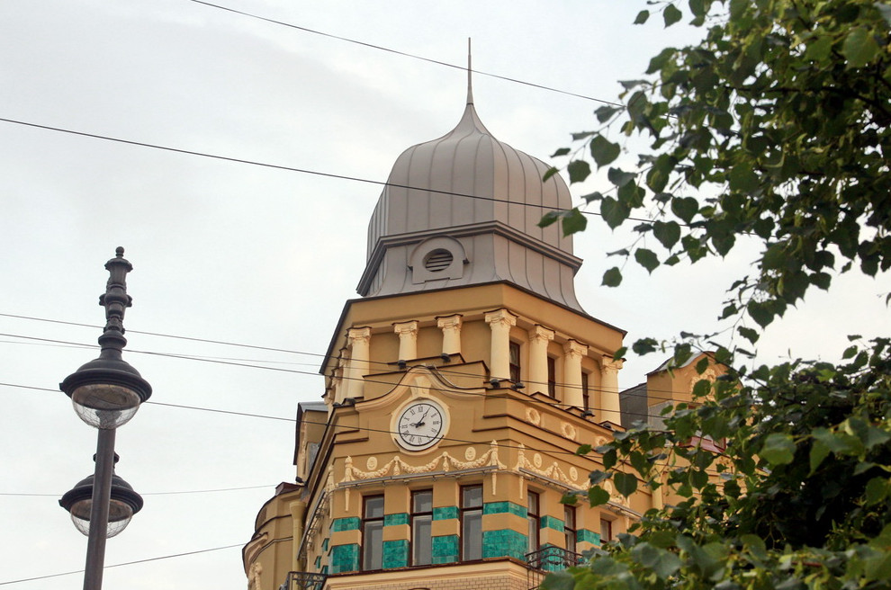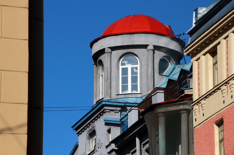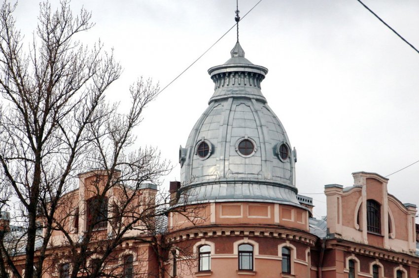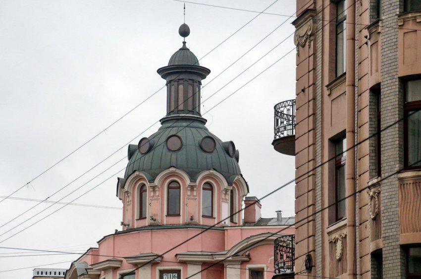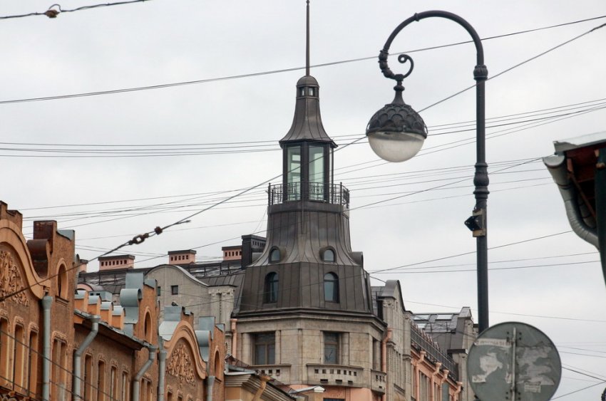 Дом Мельцеров на углу Волынского переулка и Большой Конюшенной улицы был построен в 1905 году по проекту Федора Лидваля. Его завершала башенка с двухъярусным куполом шлемовидной формы. В 1970-х она пропала. Восстановили ее в 2008 году.