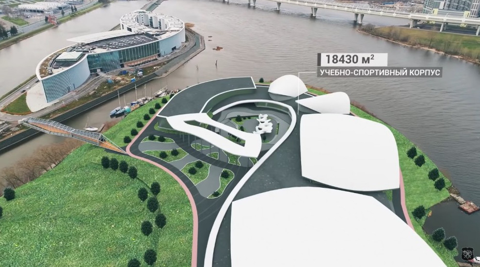 Министерство обещало создать вторую очередь пансиона — через протоку на Крестовском острове, северо-восточнее Бычьего острова. Она описывалась как учебно-спортивный комплекс с ледовым катком, а между объектами анонсировали крытый поворотный мост. Год назад была представлена архитектурная концепция.