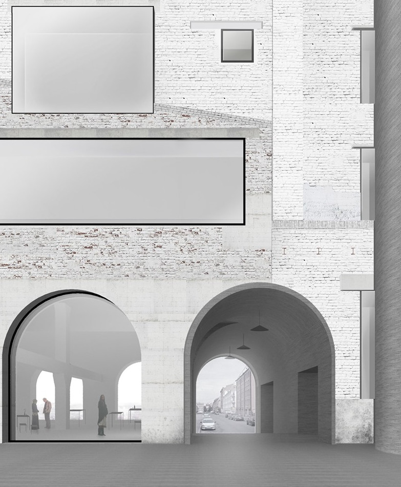 Во дворе пристроят «почти кубическое» новое здание, которое будет «предельно нейтрально и просто». Нижний этаж облицуют «клинкерным кирпичом ручной формовки», остальные сделают полностью стеклянными под «ажурной стальной сеткой». На картинке создается впечатление, что новостройка будет почти вдвое выше «сталинки», а значит, она может вторгнуться в перспективу Сытнинской улицы. Однако сам Сергей Мишин заявил «Канонеру», что дворовый корпус запроектирован ниже лицевого.