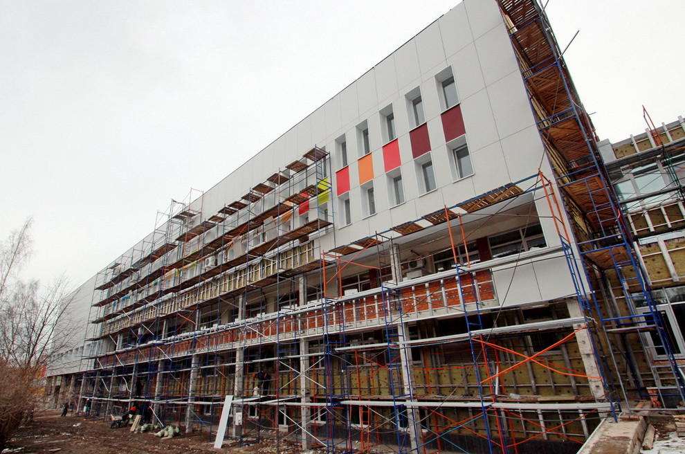 Фасады детской больницы № 1 на Авангардной улице, 14, станут яркими и жизнерадостными. Сейчас их утепляют, а заодно меняют облик за счет цветных панелей.