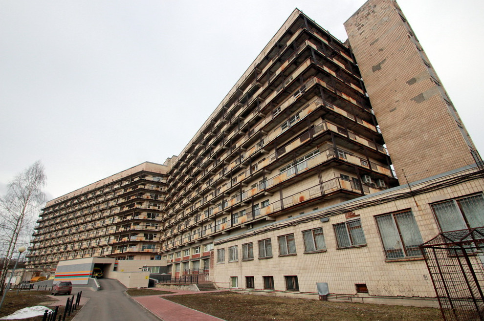 Больница была построена в 1976 году. Ее проект разработали архитекторы Абрам Гольдин и Нина Ефимова. Основной корпус, стоящий торцом к Авангардной улице, имеет 11 этажей, с севера к нему примыкает 2–4-этажное крыло. Тогда фасады были покрыты мелкой светлой плиткой.