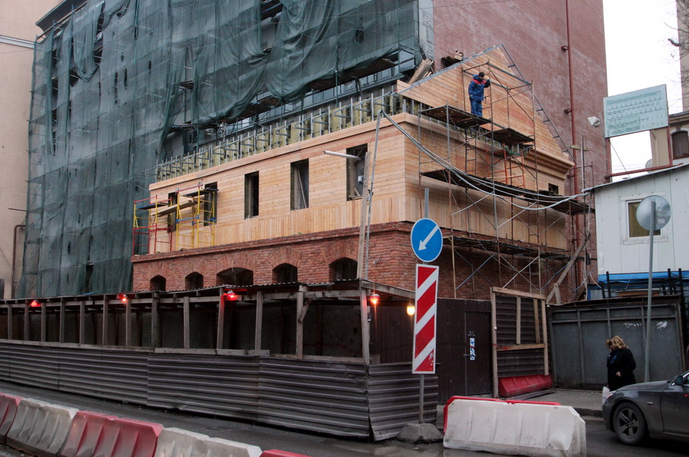 В конце 2013 года ООО «Балт инвест групп» получило разрешение на начало работ. Весной 2014-го демонтировали второй, деревянный этаж старинного домика. Этому предшествовала техническая экспертиза, показавшая необходимость разборки сгнивших стен. Впоследствии второй этаж восстановили из железобетона с деревянной отделкой.