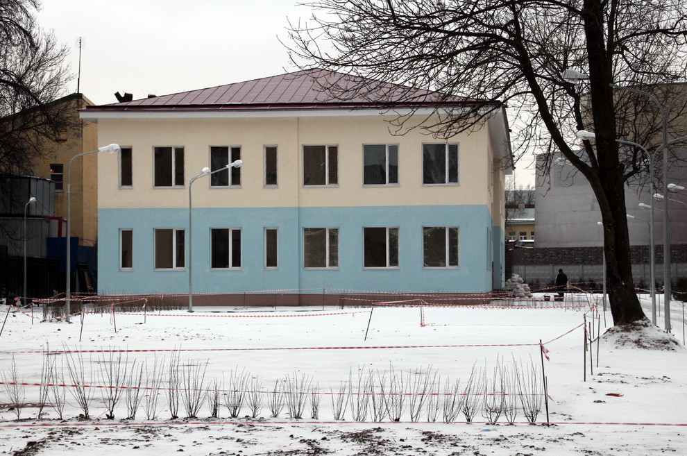 На Курляндской улице, 26, завершается капитальный ремонт двухэтажного детского сада. Со сталинского здания счистили весь декор, а получившуюся коробку раскрасили в два цвета.