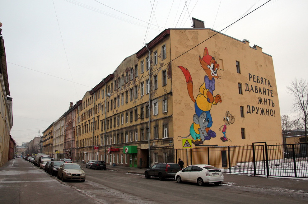 Помимо прочего, на брандмауэр соседнего жилого дома (22–24) нанесли рисунок Леопольда, причем поверх многочисленных утрат штукатурки без ее восполнения. Можно предположить, что изображение это не было согласовано с комитетом по градостроительству и архитектуры, а значит, является незаконным. Этот момент «Канонер» планирует выяснить.