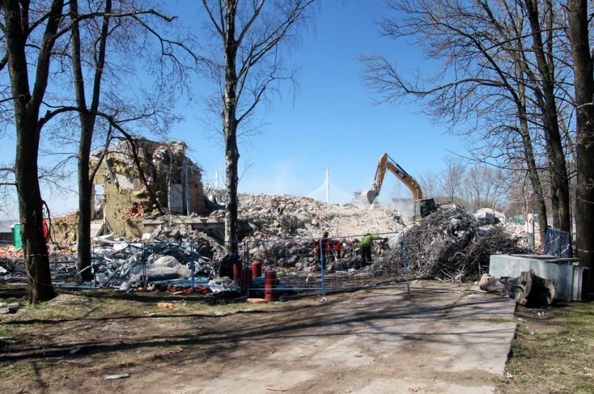 Снос прошел за один день, причем субботний, в конце августа. Работы провело ООО «Атлант». Почти сразу же генподрядчик строительства моста ЗАО «Пилон» принялся рыть котлован под опоры.