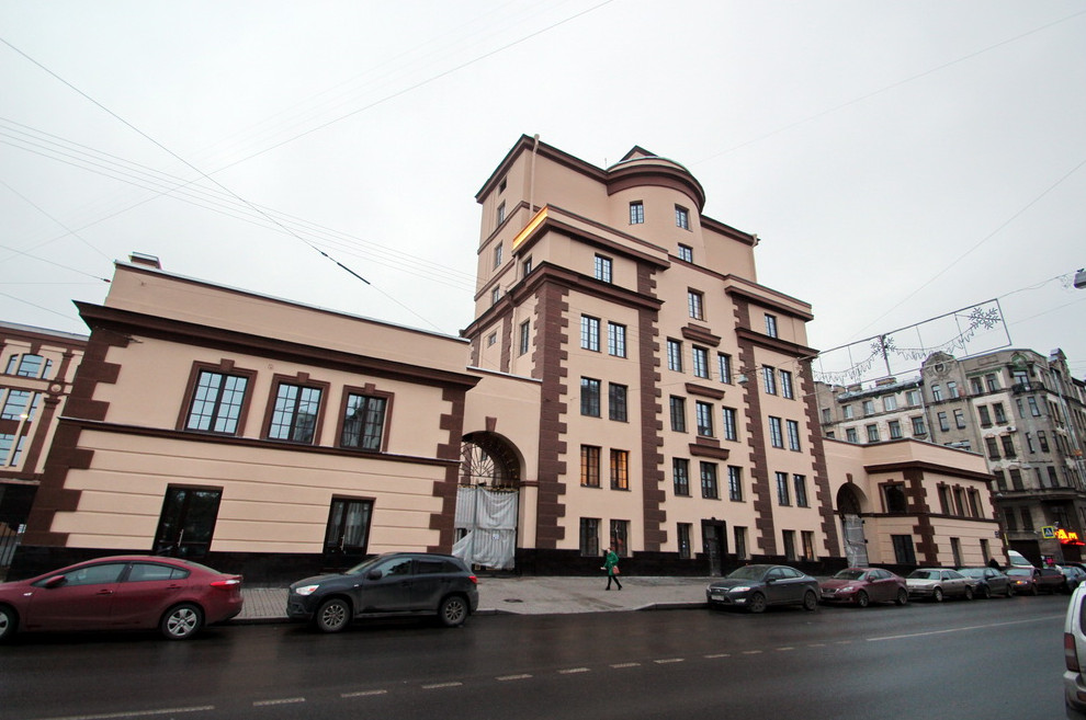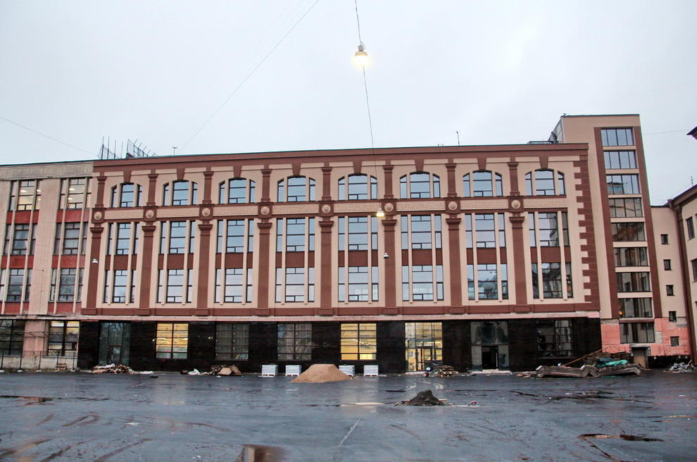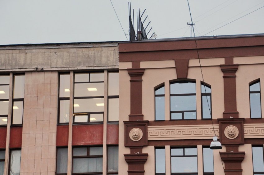 Советскому зданию завода «Измеритель» на Чкаловском проспекте, 50, переделали фасад. Ради создания здесь бизнес-центра на стене появились львиные маскароны и меандры.