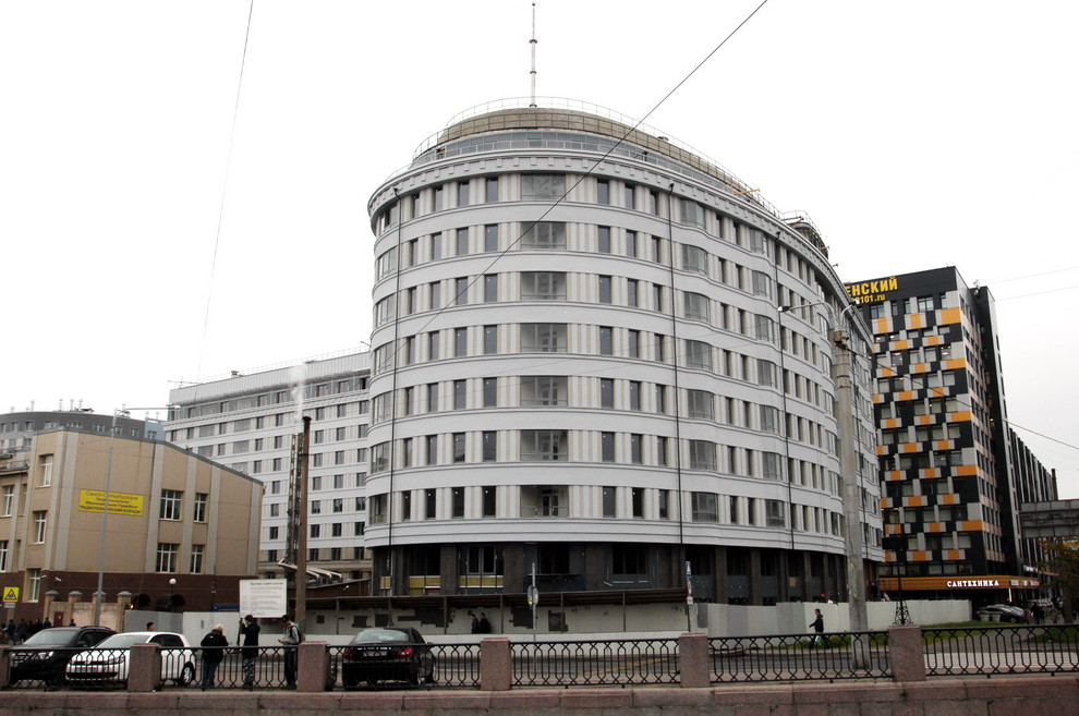 Жилой дом со скругленным фасадом построили на углу набережной реки Смоленки и Уральской улицы. Он разместился на месте части территории завода имени Калинина.