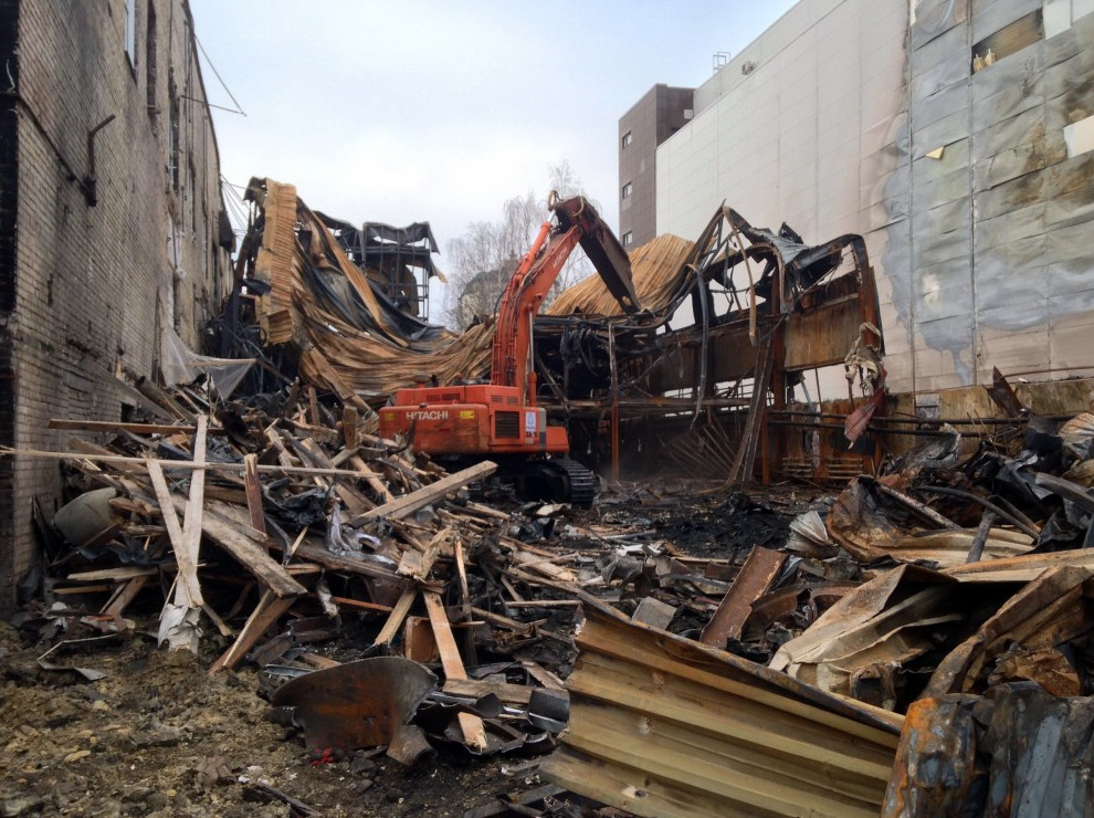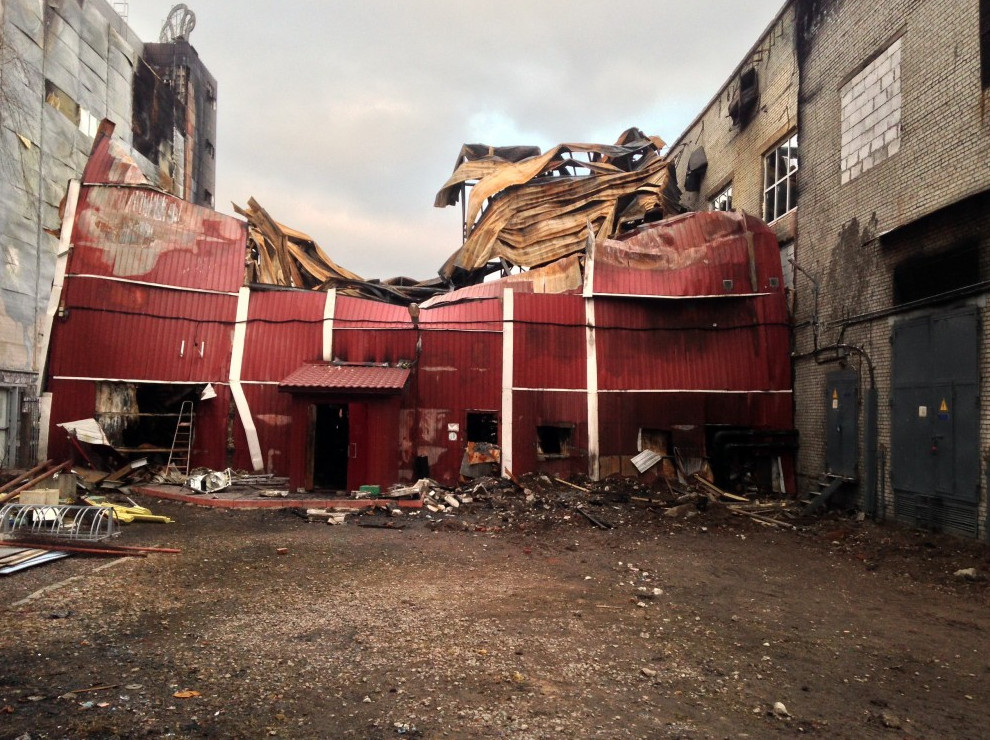 В конце января здесь произошел крупный пожар. В результате пристройка оказалась не восстановима: 800 кв. метров металлических конструкций обрушилось. Погибли два человека. Пострадала и стена соседнего здания.