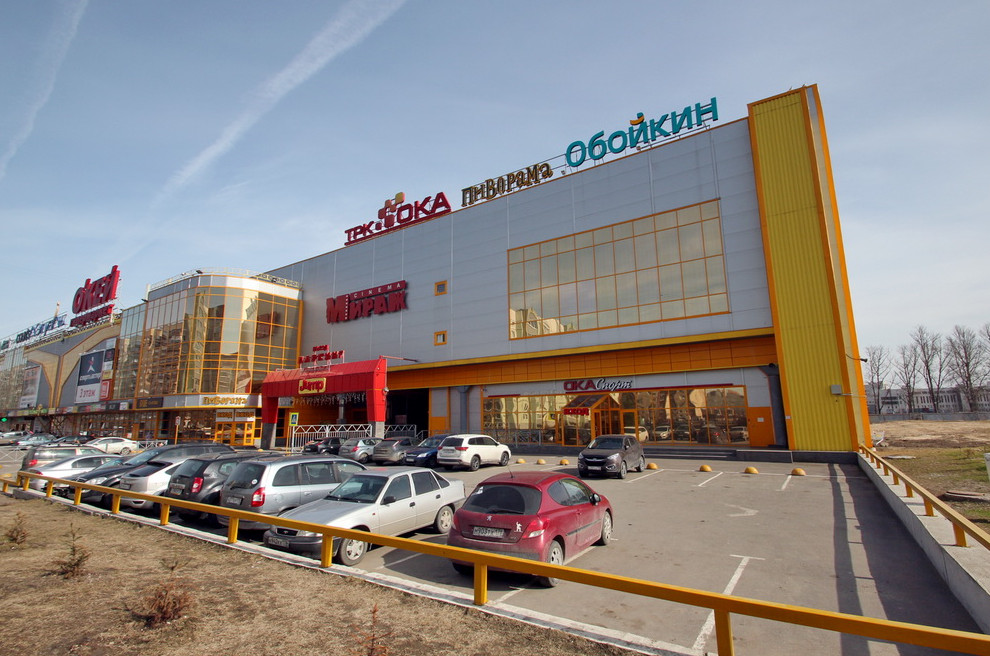 Главное здание торгового комплекса «Ока» было построено в 2010 году. Оно расположилось вдоль Октябрьской улицы. В течение 2012–2013 годов к ней пристроили вторую очередь, причем незаконно. Встала она на том месте, где, согласно красным линиям, должна была пройти улица Ижорского Батальона.