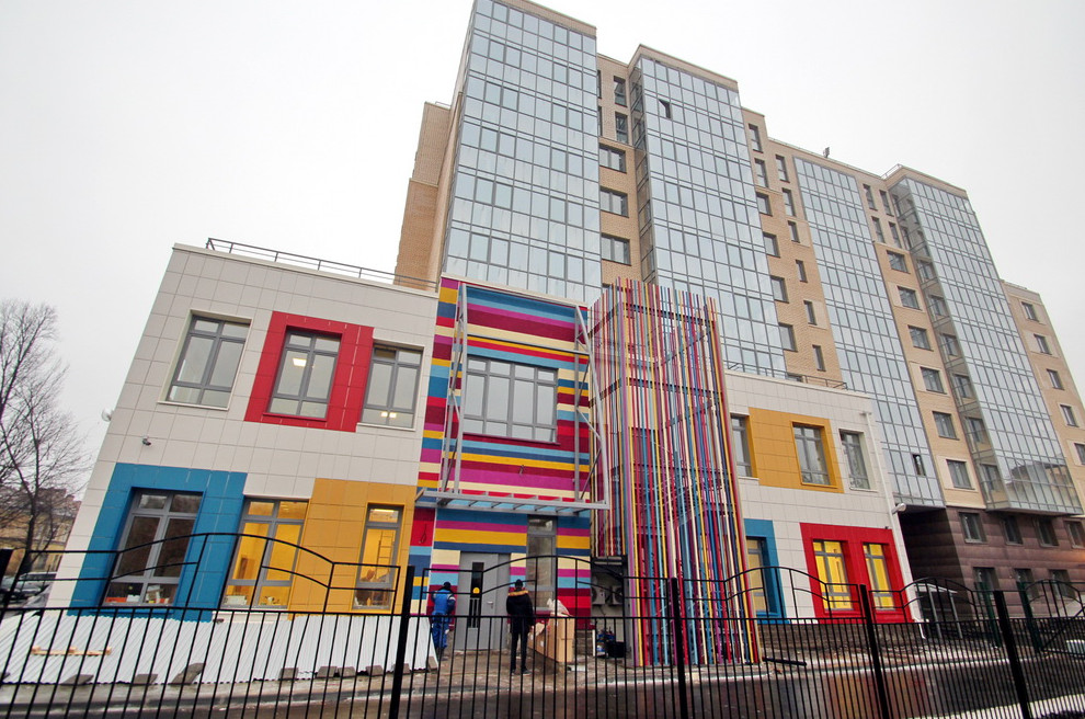 На месте типовой школы на Севастопольской улице, 9, завершилось строительство жилого дома. В его объем со двора внедрили пристроенный детский сад с разноцветными фасадами.