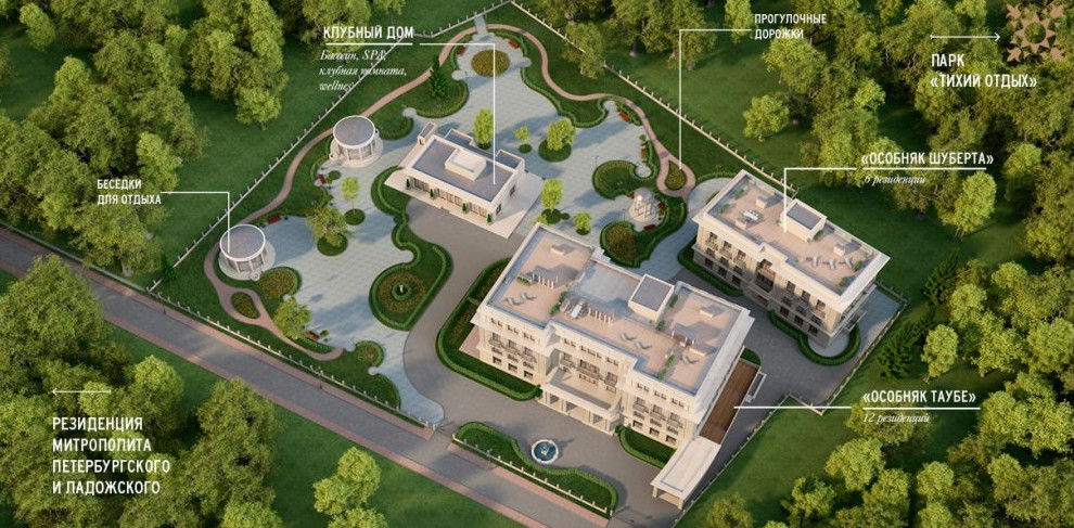 Всего в комплексе предусмотрено 18 квартир с дворцовыми интерьерами. В том же стиле, что и дома, создадут парковые павильоны — беседки и сараи. Часовня не запланирована. Зато отмечается близость с резиденцией митрополита Санкт-Петербургского и Ладожского.
