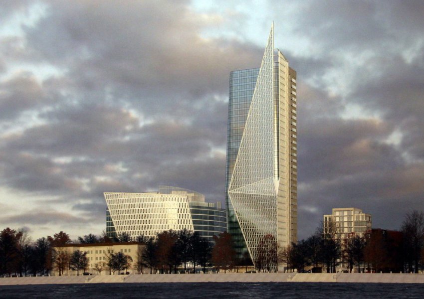 На углу Октябрьской набережной и улицы Тельмана будет построен офисный небоскреб, к которому хотят прикрепить стеклянный парус. За два года проект изменился: высотку понизили на 20 метров.
