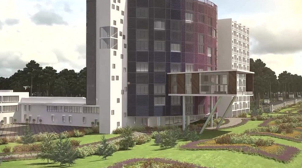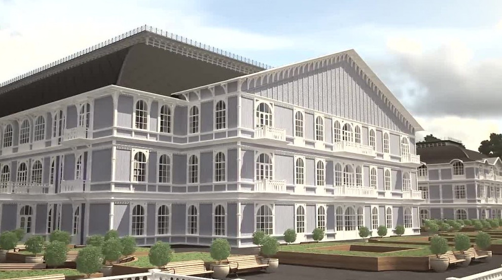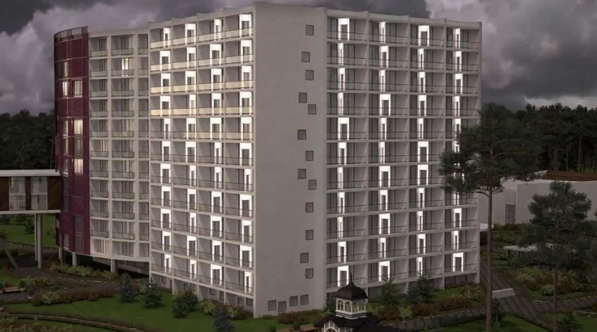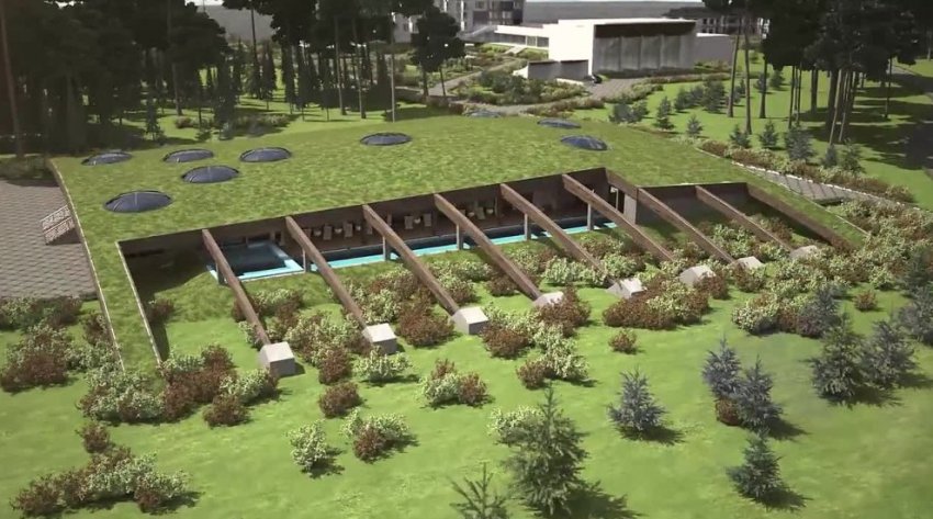 Действующий корпус грязелечебницы, построенный в 1969 году, будет снесен, так как «устарел и не соответствует современным требованиям». Его «реконструируют» в здание в виде зеленого холма с травой на крыше. Здесь тоже будет подземная парковка, а также бассейны по периметру.