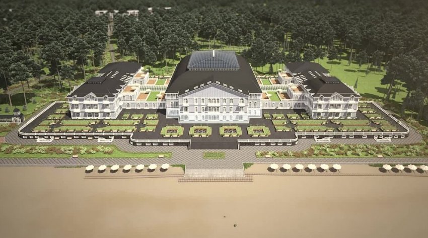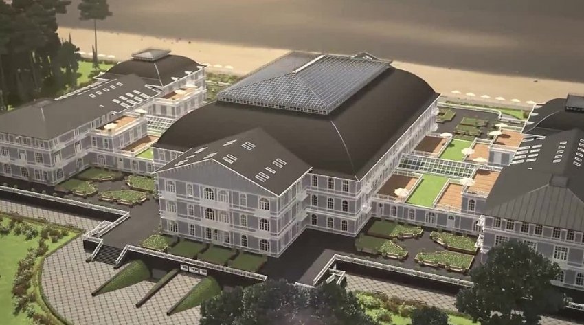 По этому проекту, на месте утраченного курзала, построенного по проекту архитектора Зигфрида Леви, появится кирпичная новостройка, облицованная деревом и отдаленно напоминающая историческое деревянное здание в технике фахверк. Это будет жилой дом («апартамент-отель класса люкс»). Трехэтажное здание вместо шпилей увенчает мансарда. В огороженном забором цоколе оборудуют стоянку и бассейн.