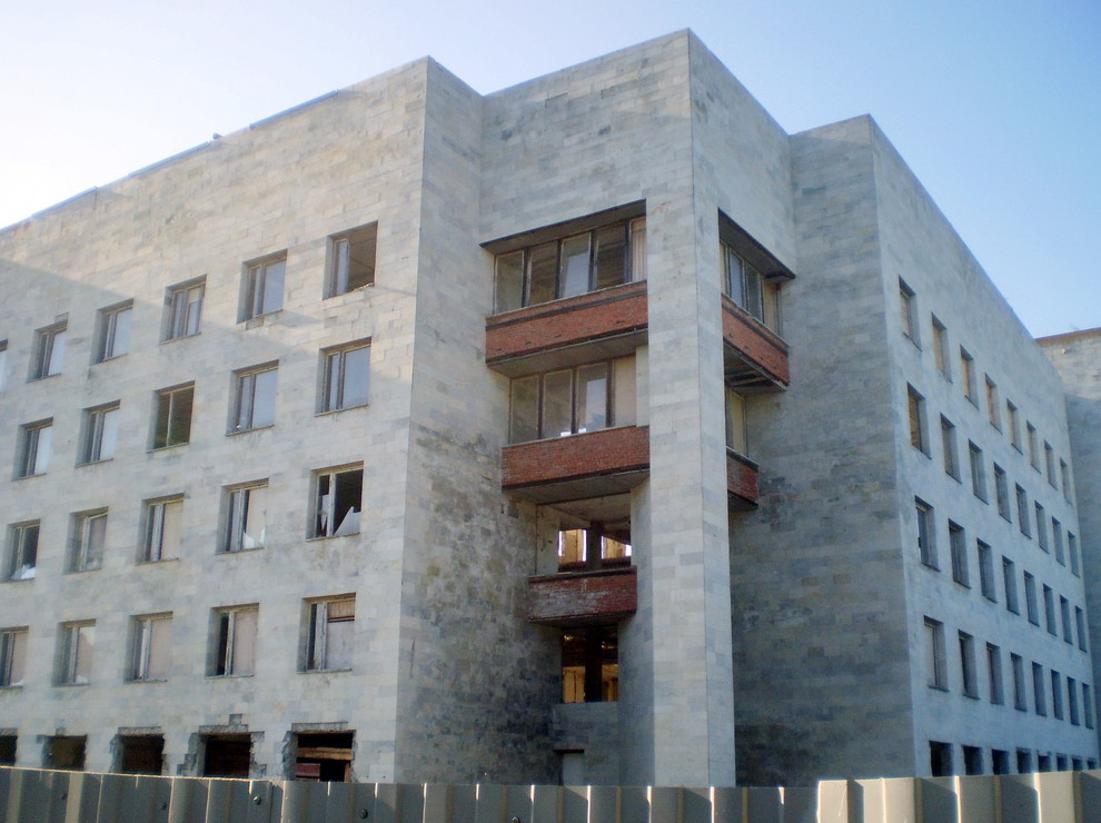 Пятиэтажное здание напротив проходной Красносельской экспериментальной бумажной фабрики начали строить около 1990 года. Внутри планировалось разместить лабораторный корпус ВНИИ целлюлозно-бумажной промышленности. Но в 1993-м работы бросили в высокой степени готовности. С тех пор П-образное в форме здание стояло на берегу Дудергофки.