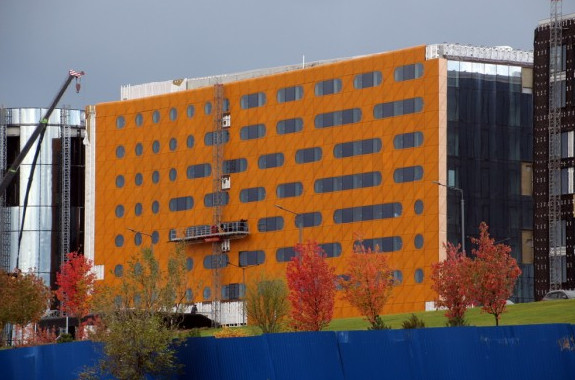 По словам гендиректора ЛенспецСМУ Геннадия Щербины, чуть ли не главной архитектурной особенностью комплекса должен был стать золотистый козырек над парадным входом, выполненный в форме параболы. Но когда его конструкция проходила экспертизу в Германии, она не выдержала ветровые нагрузки. Так что теперь козырек появится не ранее чем через год, рассказал господин Щербина журналу «Стройметалл».