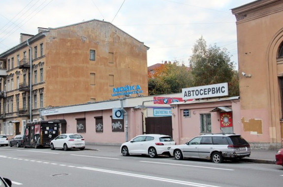 Банк и жилой дом планируется построить на углу Лодейнопольской и Петрозаводской улиц. Для этого потребуется снести сталинскую постройку и ангары автосервиса.