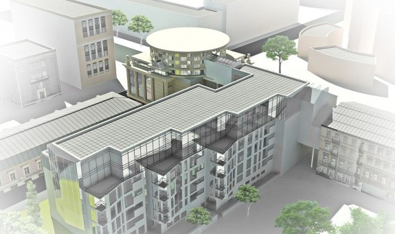 На примыкающем земельном участке, на Лодейнопольской улице, 7, где сейчас стоят не претендующие на архитектуру одноэтажки автосервиса, вырастет жилой дом. На улицу будут выходить пять этажей, еще два утопят вглубь квартала. Господин Марковский убежден, что получившийся фасад в виде лестницы «фоновый, не выделяющийся из окружающей застройки».