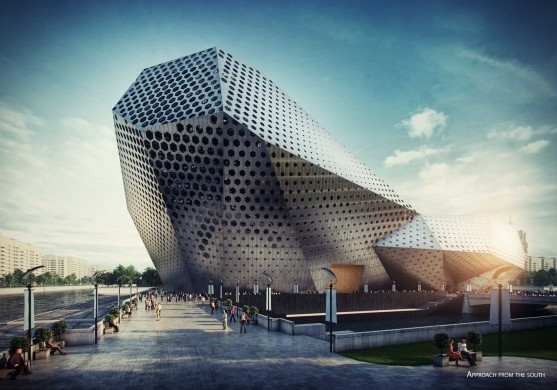 Архитектурная концепция была разработана английским архитектурным бюро Populous. Адаптацией ее к России занималось ООО «Проектно-производственная фирма „А.Лен“» Сергея Орешкина. Предполагалось возвести здание в форме бриллианта, напоминающее, по словам господина Орешкина, проект Доменика Перро для второй сцены Мариинского театра. Внутри был бы концертный зал для 14 тыс. зрителей и, как всегда в таких случаях, много коммерческих помещений разного назначения в нагрузку.