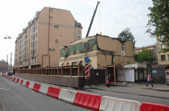 В декабре 2013 года ООО «Балт инвест групп» получило разрешение на строительство, а в феврале 2014-го начался снос. Первыми пали дворовые стены. Сейчас разрушители ломают второй, деревянный этаж, выходящий на 9-ю Советскую улицу. По словам очевидцев, ради проекта вырубили два из трех деревьев в сквере, расположенном по правую руку от стройплощадки.