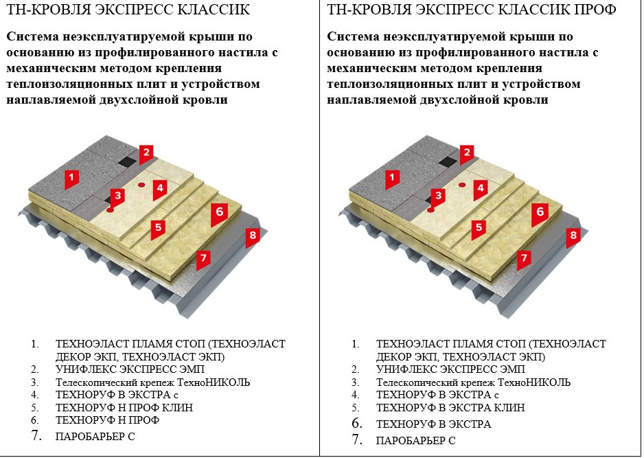 Теплоизоляция в системе ТН-КРОВЛЯ Экспресс Классик тоже двойная. Помимо плит из каменной ваты, кашированных стеклохолстом, в конструкции применяются плиты из каменной ваты ТЕХНОРУФ Н ПРОФ (с прочностью на сжатие при 10%-ной линейной деформации не менее 40 кПа) или ТЕХНОРУФ ПРОФ (с прочностью на сжатие не менее 60 кПа). Если необходимо создать уклон, выбирают ТЕХНОРУФ Н ПРОФ КЛИН (прочность – не менее 40 кПа) или ТЕХНОРУФ В ЭКСТРА КЛИН (не менее 65 кПа).