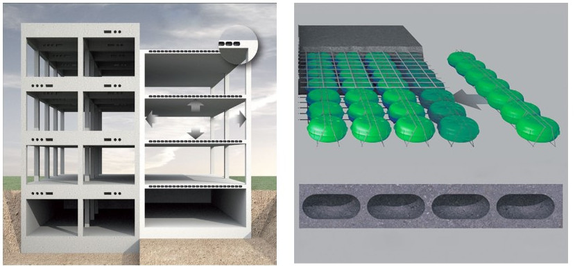 Идея этого решения проста, как все гениальное: пустотообразователи из переработанного пластика заменяют массивный бетон внутри железобетонного перекрытия. Это позволяет серьезно сэкономить ценный материал и энергию (до 40% бетона и до 20% арматурной стали). Кроме того, снижается выброс образующихся при производстве цемента и бетона токсичных веществ, таких как, например, CO2 - по подсчетам специалистов, примерно на 20%. Замена массивного бетона модулями внутри бетонного перекрытия позволяет существенно уменьшить сроки строительства. Это происходит за счет сокращения процесса армирования плит, так как пустообразователи уже имеют свой арматурный каркас.