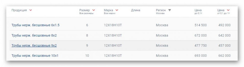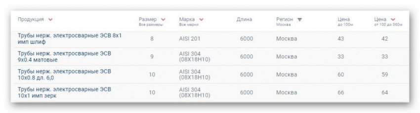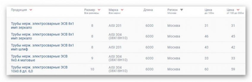 Металлопрокат из нержавеющей стали имеет достаточно высокую цену. Однако его качественные свойства позволяют в несколько раз увеличить сроки эксплуатации готовых изделий, что это делает его стоимость экономически оправданной. Для сравнения приведем несколько позиций каталога нержавеющих труб металлмаркета «МЕТАЛЛСЕРВИС».