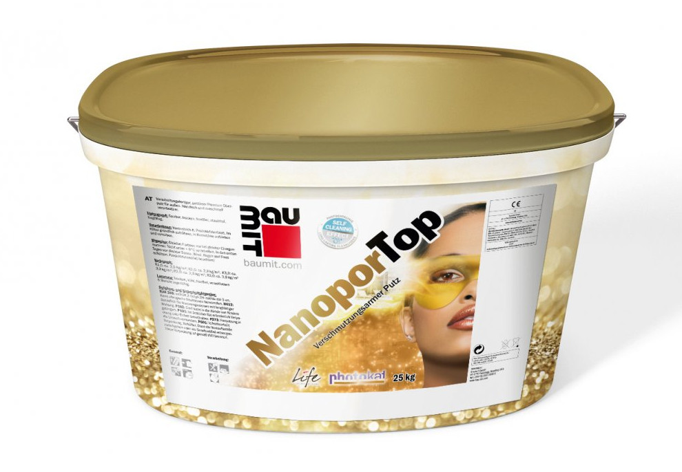 Другие покрытия - штукатурка Baumit NanoporTop и краска Baumit NanoporColor - созданы с использованием нанотехнологий. Их особенность - способность к самоочищению, основанная на эффекте фотокатализа. Фасады с таким покрытием сияют как новые на протяжении многих лет. Влага и грязь просто скатываются с их поверхности.