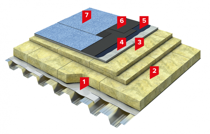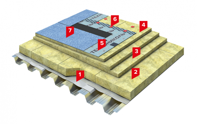 1. ПАРОБАРЬЕР С (А500 или Ф 1000); 2.Телескопический крепеж ТехноНИКОЛЬ; 3. Минераловатный утеплитель ТЕХНОРУФ Н ПРОФ; 4. Минераловатный утеплитель ТЕХНОРУФ Н КЛИН; 5. Минераловатный утеплитель ТЕХНОРУФ В ПРОФ С; 6. УНИФЛЕКС ЭКСПРЕСС; 7. ТЕХНОЭЛАСТ ПЛАМЯ СТОП