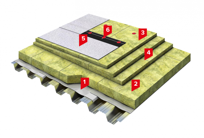 1. ПАРОБАРЬЕР С (А500 или Ф 1000); 2. Минераловатный утеплитель ТЕХНОРУФ Н ПРОФ; 3. Минераловатный утеплитель ТЕХНОРУФ Н КЛИН; 4. Минераловатный утеплитель ТЕХНОРУФ В ЭКСТРА; 5.Телескопический крепеж ТехноНИКОЛЬ; 6. ТЕХНОЭЛАСТ СОЛО РП 1.