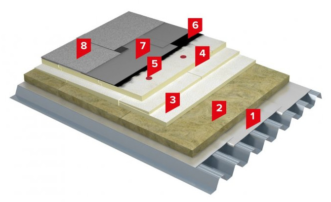 1. ПАРОБАРЬЕР С (А500 или Ф 1000); 2.Минераловатный утеплитель ТЕХНОРУФ Н ПРОФ; 3. Плиты теплоизоляционные LOGICPIR CXM/CXM SLOPE; 4. Плиты теплоизоляционные LOGICPIR CXM/CXM; 5. Телескопический крепеж ТехноНИКОЛЬ; 6. УНИФЛЕКС ЭКСПРЕСС (УНИФЛЕКС С); 7. Праймер битумный ТЕХНОНИКОЛЬ №01; 8. ТЕХНОЭЛАСТ ПЛАМЯ СТОП.