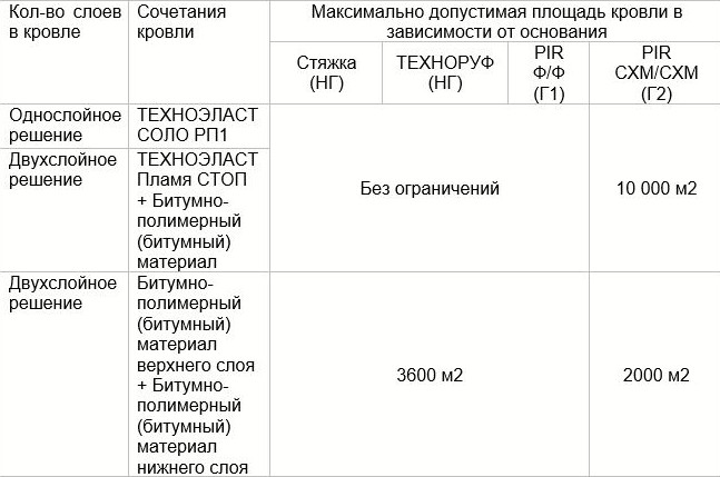 Еще одно важное преимущество ТЕХНОЭЛАСТ ПЛАМЯ СТОП и ТЕХНОЭЛАСТ СОЛО РП1: проектные решения с участием данных мембран существенно облегчают устройство противопожарных рассечек на значительных площадях, либо вообще не требуют монтажа противопожарных поясов согласно таблице выше.