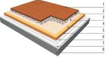 ![]() | 1 – тротуарная плитка; 2 – дренажный слой из гравия фракции 10-20 мм; 3 – разделительный слой; 4 – ПЕНОПЛЭКС®; 5 – разделительный слой; 6 – гидроизоляция PLASTFOIL®; 7 – разделительный слой; 8 – несущее основание под кровлю (ж/б плита). |