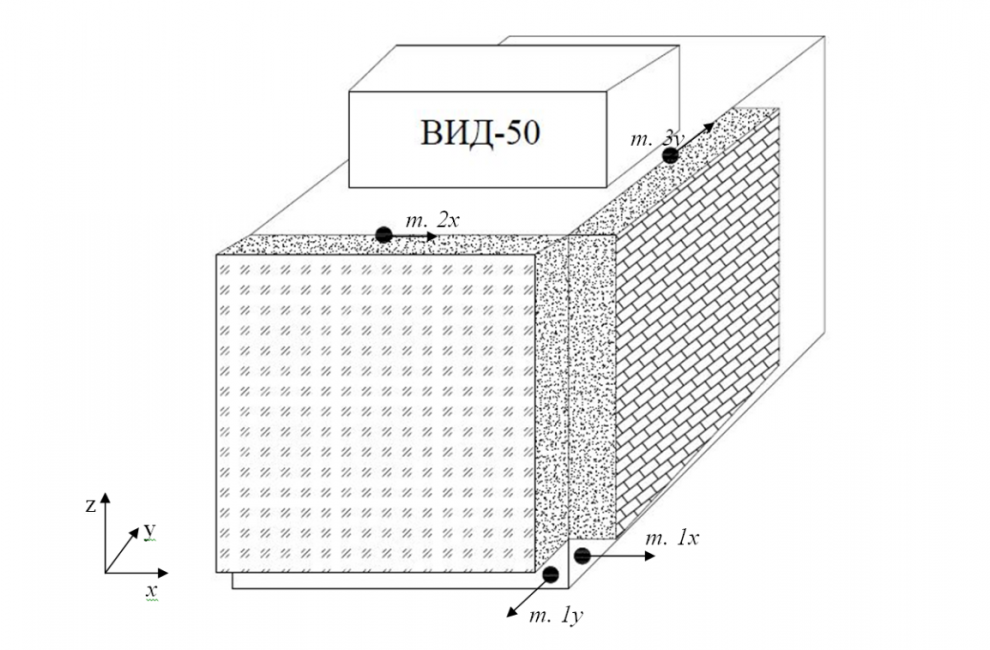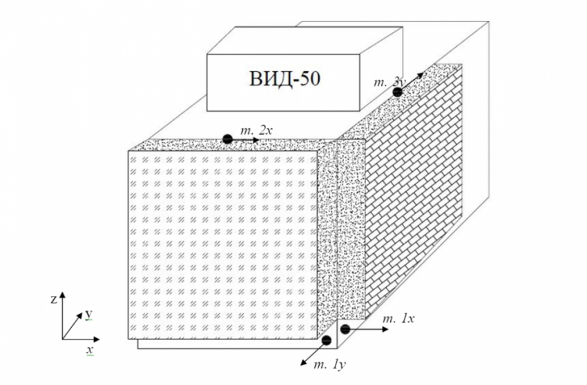 Для регистрации параметров воздействия на испытуемую конструкцию использовались датчики акселерометры совместно с цифровым многоканальным измерительным комплексом. Датчики акселерометры представляют собой преобразователи механических движений в пропорциональный электрический сигнал. Записи ускорений колебаний, зарегистрированные датчиками, являются основной инструментальной информацией для определения параметров воздействия на испытываемые комплекты при сейсмических испытаниях. Условная схема расположения датчиков акселерометров представлена на рисунке.