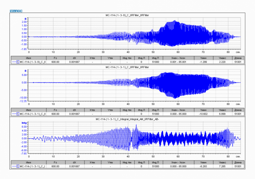 С помощью регистрирующей аппаратуры были получены и проанализированы записи ускорения колебаний исследуемой конструкции при проведении испытаний. Также была выведена осциллограмма перемещений верхней части конструкции относительно нижней. На рисунке 5 приведены примеры записей ускорения колебаний точек т.1 (а) и т.2 (б), а также осциллограмма перемещений т.2 относительно т.1.