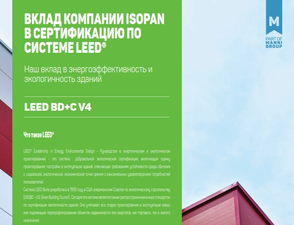 Нужно отметить, что изоляционные панели Isopan с алюминиевой облицовкой абсолютно удовлетворяют требованиям международной экологической сертификации LEED. Этой продукции начислены баллы в категориях: интегрированный проектный процесс, потребление энергии и параметры атмосферы, потребление материалов и ресурсов, качество среды внутри помещения.