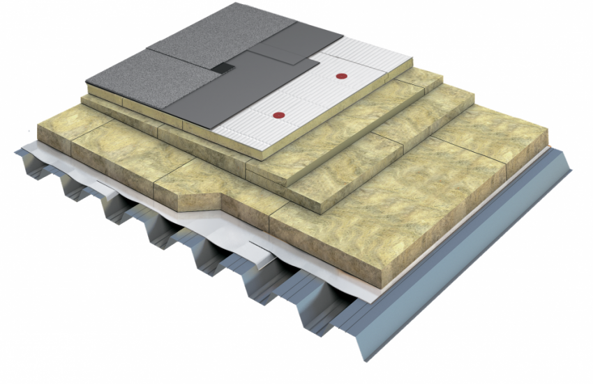 Вторым этапом на пароизоляцию укладываются теплоизоляционные материалы: плиты на основе каменной ваты с меньшей плотностью ТЕХНОРУФ Н ОПТИМА и плиты из каменной ваты с односторонним покрытием из стеклохолста ТЕХНОРУФ ПРОФ (с) с инновационным нетканым материалом из волокон стекла. Для устройства на кровле основных и контруклонов используют теплоизоляционные плиты ТЕХНОРУФ КЛИН (с уклоном в 1,7% и 4,2%).