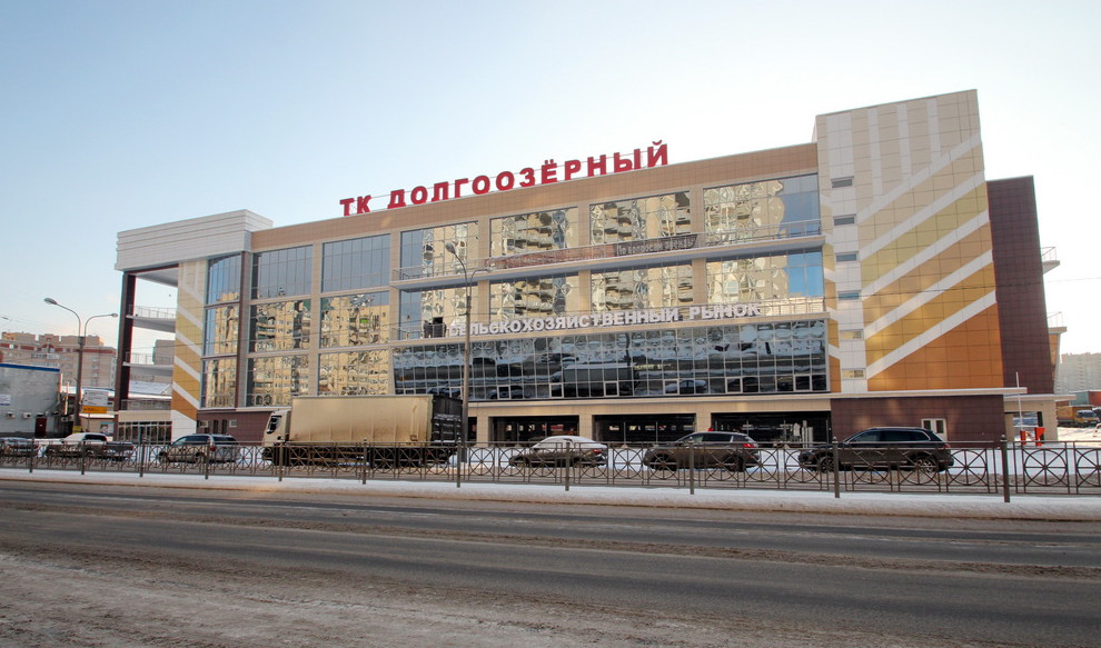 На улице Ильюшина завершилось строительство Долгоозерного сельскохозяйственного рынка. Это четырехэтажное здание, имеющее обильное остекление.