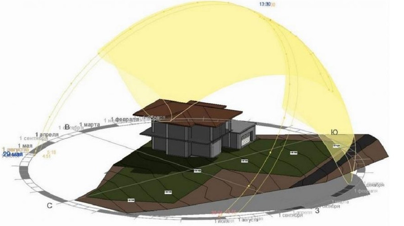 2. Учитывает инсоляцию. Инсоляция (от лат. in — «внутрь» + sōl — «солнце») Архитектор, учитывая особенности вашего суточного цикла жизни, размещает дом на земельном участке в соотношении к сторонам света таким образом, что бы будущие хозяева комфортно себя ощущали в любое время утром, днем или вечером. Также это позволит сэкономить на количестве осветительных приборов, тепловой и электрической энергии.