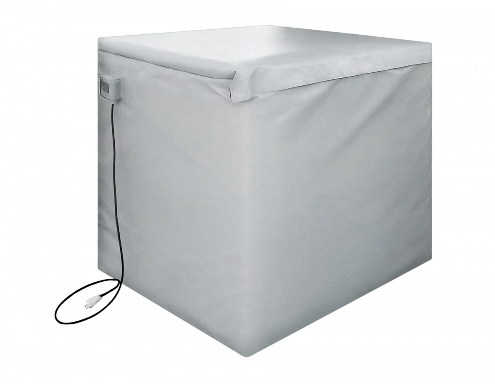 Термочехол изготовлен из армированного полимерного материала, утеплителя и ленточного электрического нагревателя. Данное оборудование надевается на поддон с битумными рулонными материалами. Он очень удобен в работе благодаря компактным размерам – 1300мм*1100мм*1100мм. Внутри, под таким «одеялом», может поддерживаться комфортная температура – до +15-20 °С, что дает возможность укладывать материалы практически как в теплое время года. Они остаются эластичными (легко разматываются, режутся и быстро наплавляются).