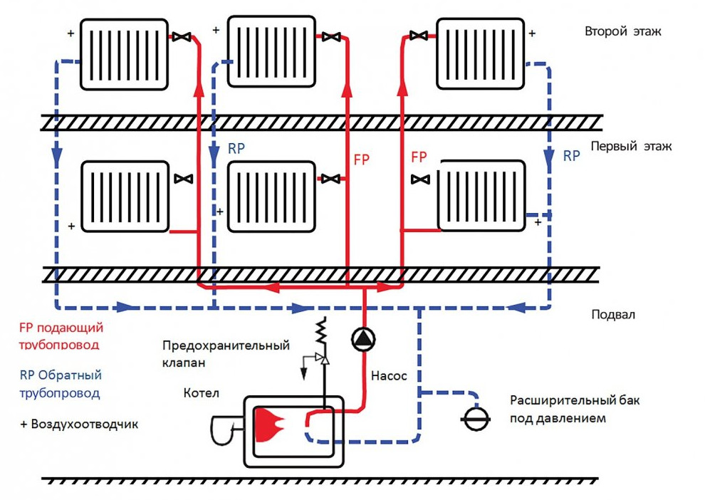 Это наиболее распространенная жидкостная система отопления. Котел обеспечивает теплоснабжение, подающий трубопровод проходит по всему дому, радиаторы получают воду из подающего трубопровода и возвращают охлажденную воду в обратный трубопровод. В целях повышения эффективности системы радиаторы оснащены термостатическими клапанами. Эти клапаны — причина вариативности гидравлического сопротивления в системе.